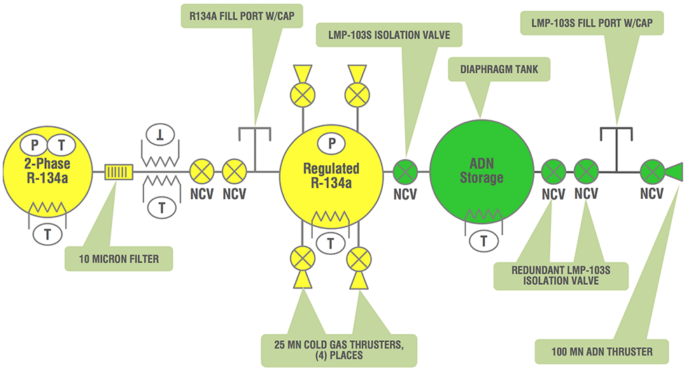 The VACCO ArgoMoon MiPS is approximately 1.3U plus the tuna can volume and uses one 100 mN green thruster to develop 783 N-sec of total impulse that provides 56 m/s of delta-V for a 14 kg CubeSat. The four 25 mN cold gas thrusters develop 72 N-sec of total impulse. Each thruster independently operates to perform both delta-V and ACS maneuvers through an integrated microprocessor controller.